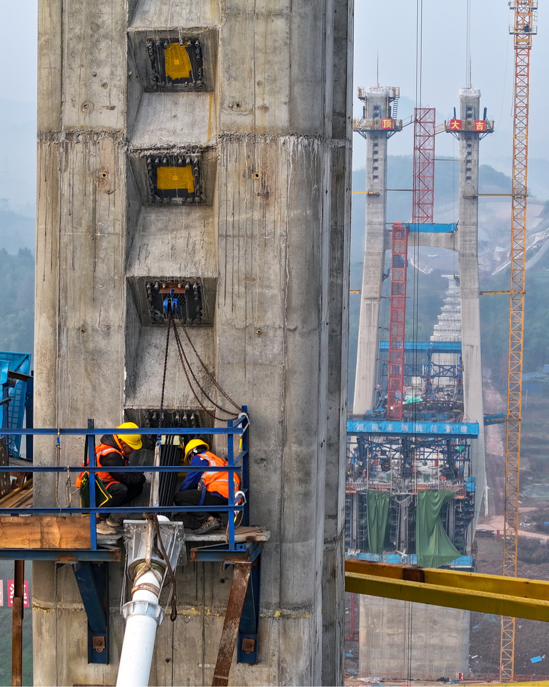“咱们要保证55根钢绞线穿孔的准确性,不让它们搅在一齐,这是最难的。”他说,“穿钢绞线会由专科的牵诱惑导完成,然则在最高点需要安排施工东谈主员进行解绳、穿孔、绑绳等操作,统共流程就像‘牵线搭桥’。”