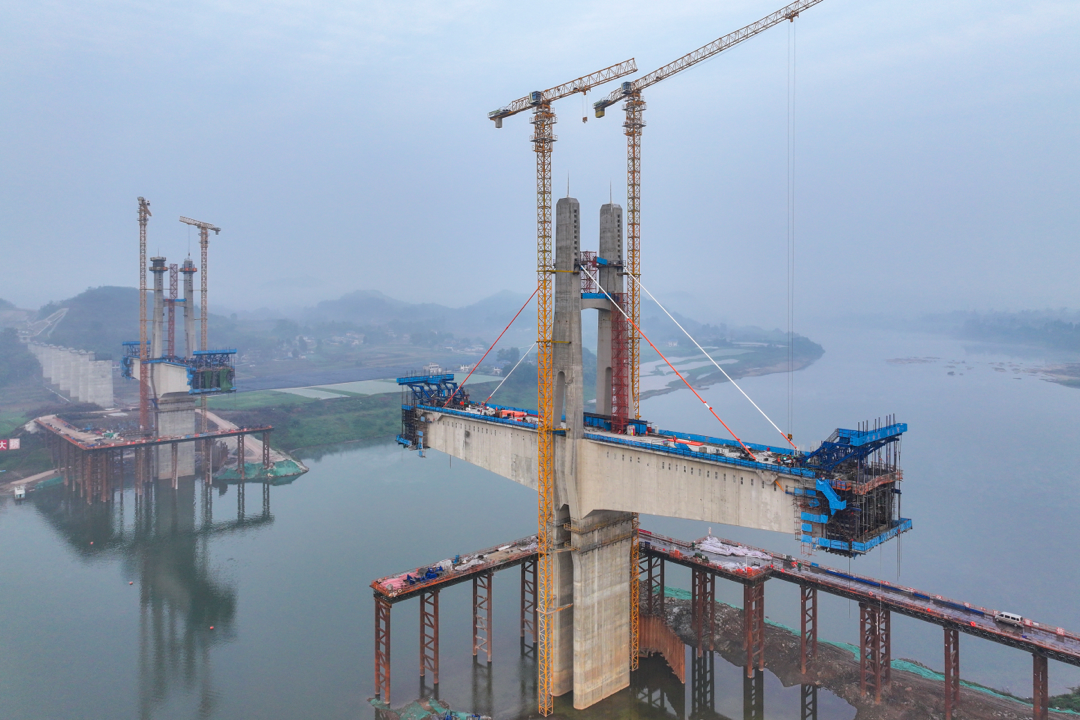 大桥横跨渠江,全长1983.81米,主跨278米,是天下跨度最大的双线高铁预应力混凝土箱梁矮塔斜拉桥。