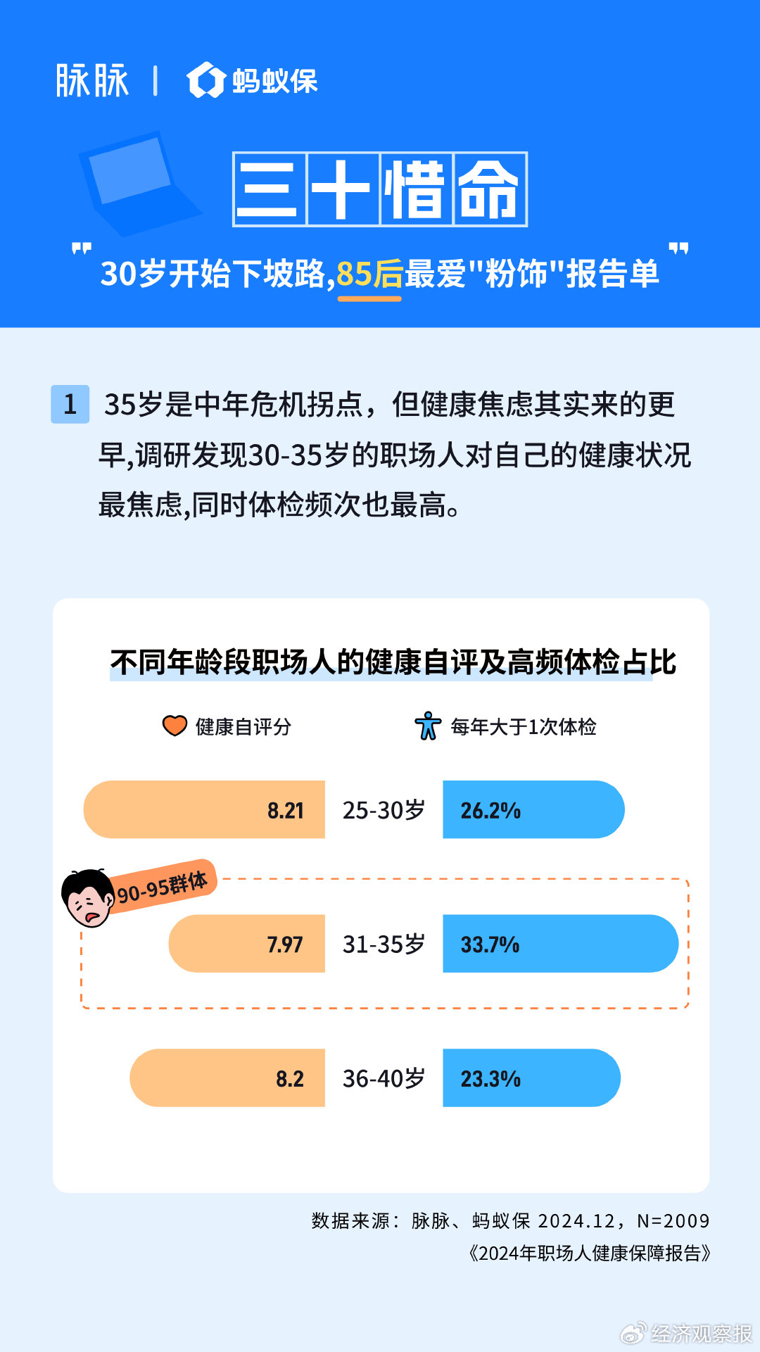 《论说》表露,受访职场东说念主无数对自己健康景况较为兴隆,平均自评分8分。在各年事段中,30岁至35岁的职场东说念主的自评低于对等分,同期该年事段的职场东说念主每年屡次体检占比最高,达到33.7%。